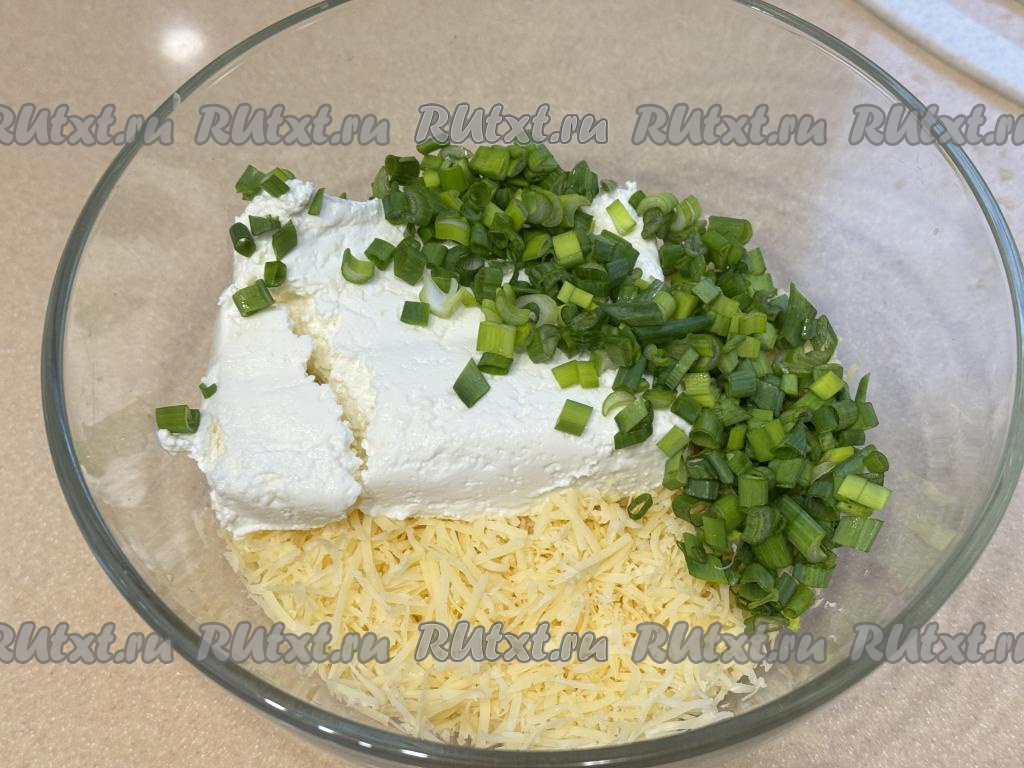 Подготовить продукты. Зелень можно взять любую (я готовила с зелёным луком, но можно использовать и укроп или петрушку). Зелень нужно промыть водой. Сыр подойдёт твёрдых или полутвёрдых сортов. Творог можно взять любой жирности.