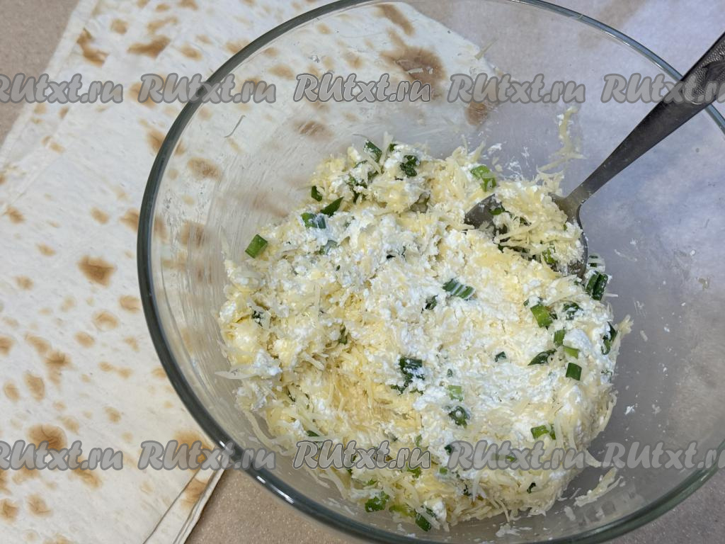 Перемешать содержимое миски до однородности и начинка для треугольников из лаваша готова. Попробовать начинку на соль и, если нужно, тогда подсолить по вкусу. У меня был достаточно солёный сыр, поэтому соль я не добавляла.