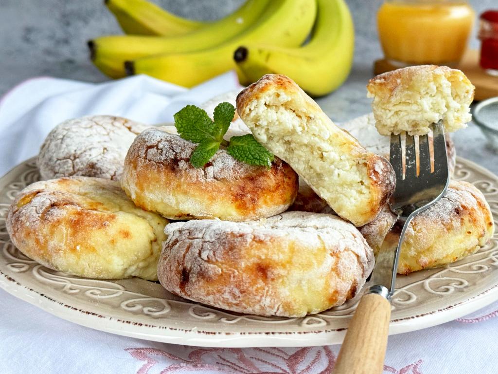 Таким же образом приготовить в аэрогриле вторую партию сырников с бананом. Переложить готовые сырники на тарелку и подать к столу.