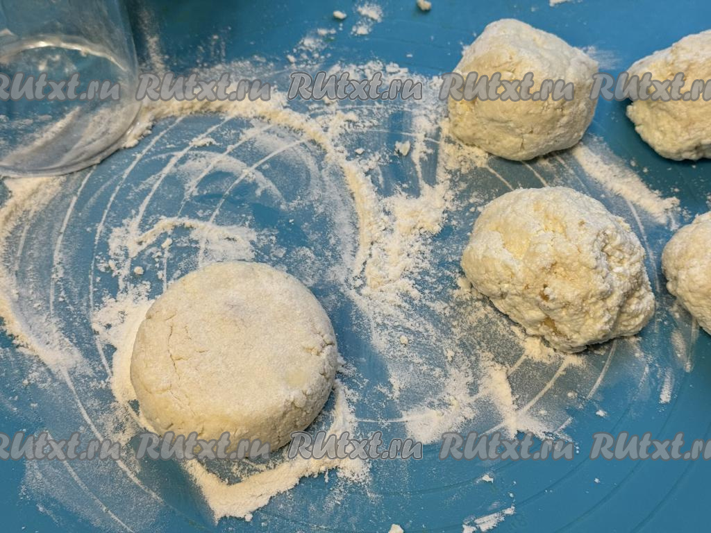 Тесто зрительно разделить на равные части. Я разделила на 8 частей, именно столько творожно-банановых сырников я и буду готовить. Руками, чуть смоченными водой, из каждой части теста на припылённой мукой поверхности формировать сырник и сразу обваливать его в муке. Постепенно сформировать все 8 сырников.