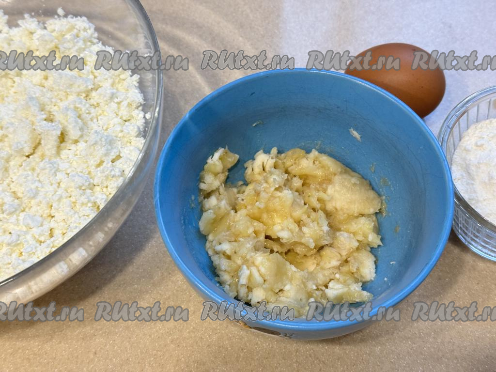 Творог выложить в достаточно глубокую миску, добавить сахар, размятый банан и сырое яйцо.