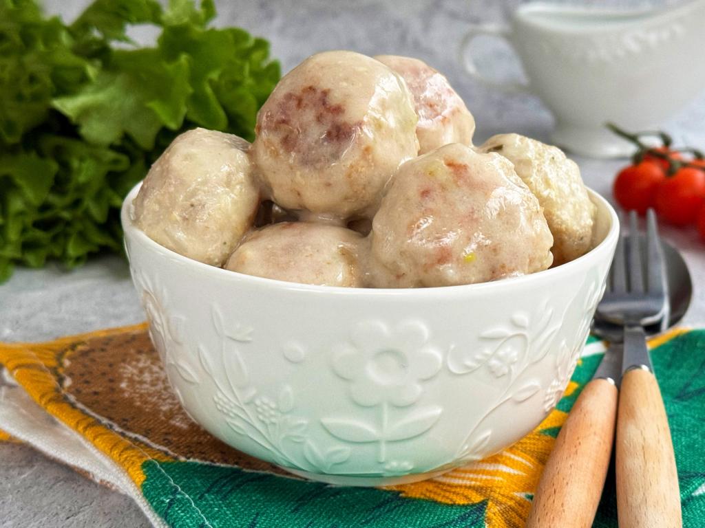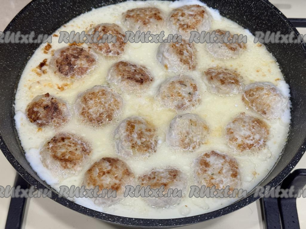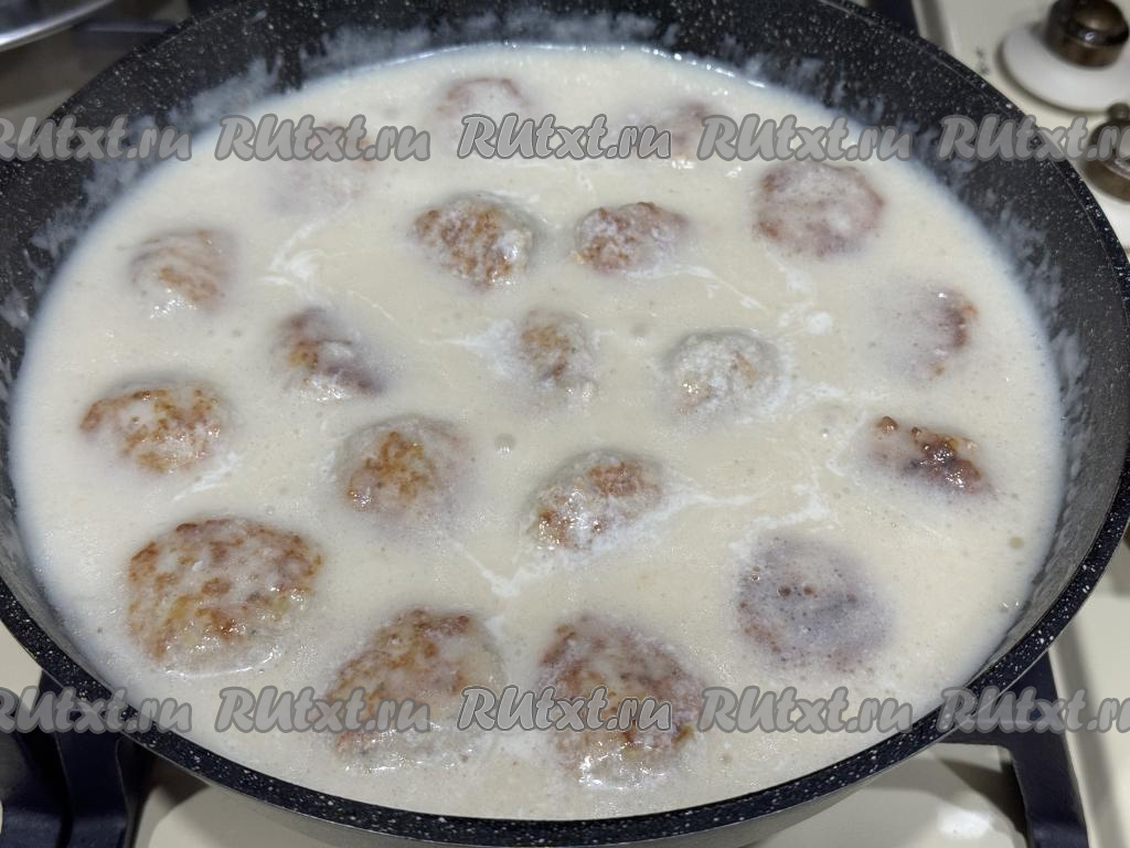 Получившийся сливочный соус влить в сковороду с обжаренными ёжиками из фарша с рисом.