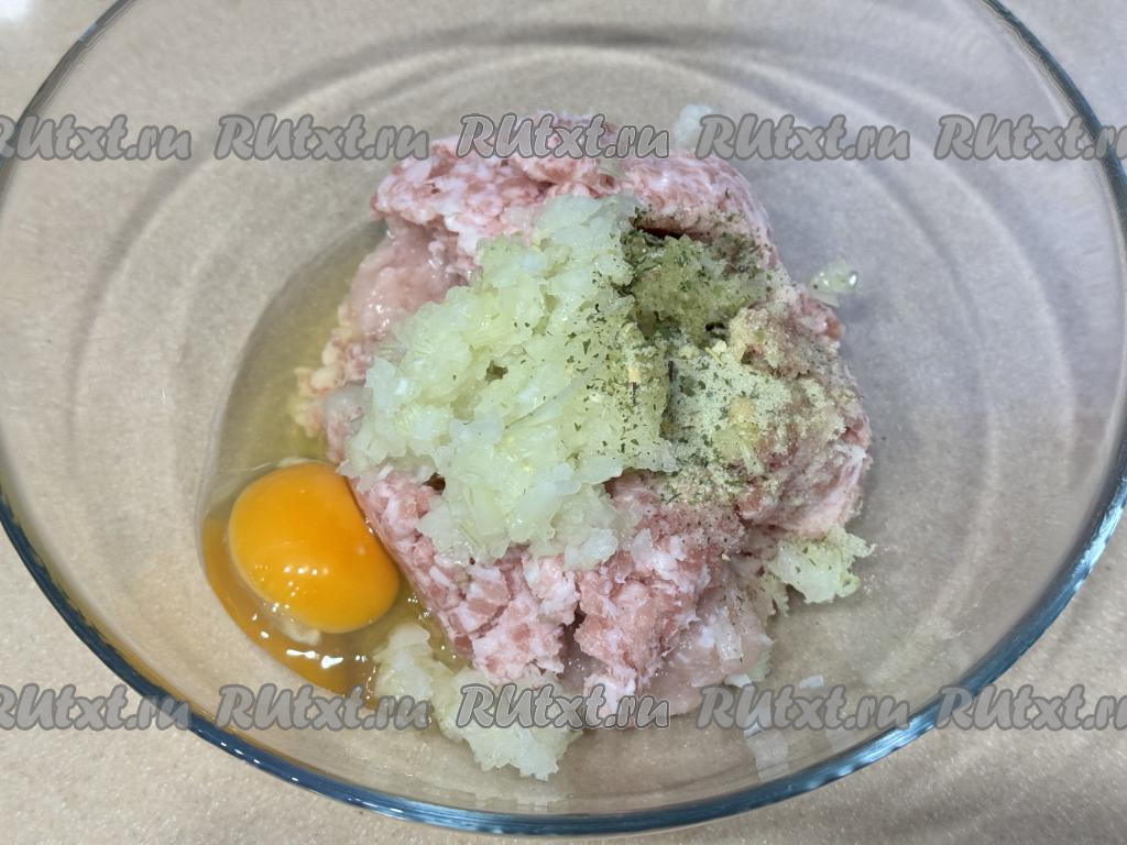 В миске соединить фарш и измельченные лук с чесноком, добавить соль и перец по вкусу.
