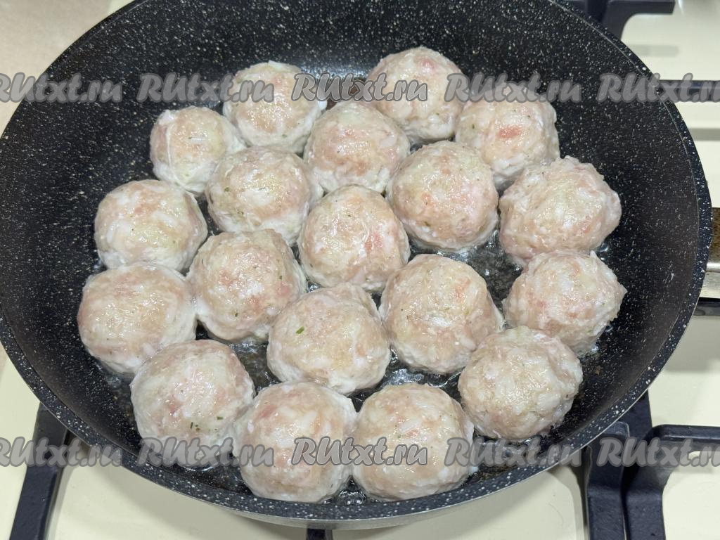 Тщательно вымесить фарш руками и сформировать ёжики размером немного больше грецкого ореха (я сформировала 19 ёжиков). В сковороду влить растительное масло, хорошо его разогреть, уменьшить огонь до среднего, выложить ёжики.