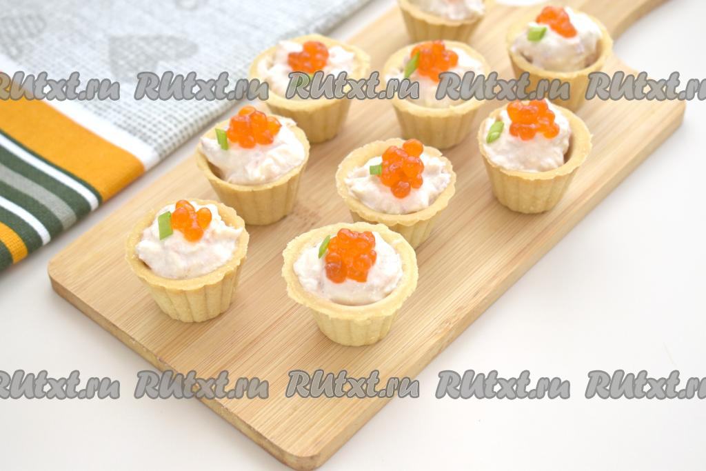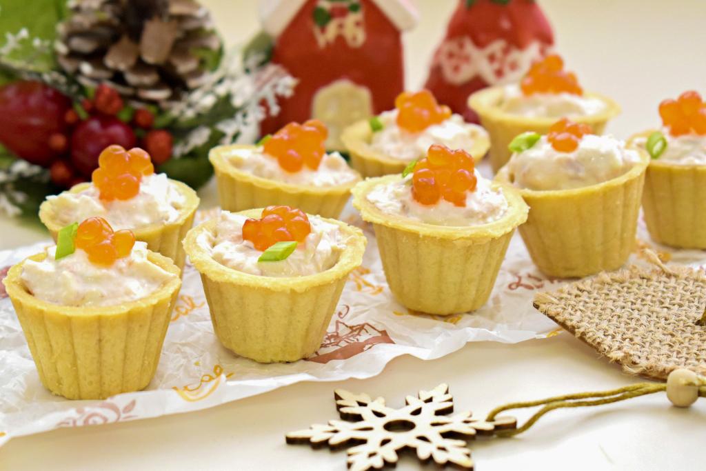 Я перед подачей украсила тарталетки красной икрой и зеленью.