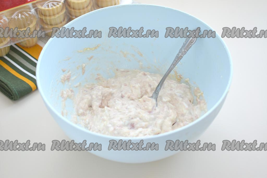 Получившуюся массу из консервированного тунца и творожного сыра перед подачей на стол раскладываем по тарталеткам. Я взяла маленькие тарталетки для икры, поэтому наполнила 15 тарталеток. Количество тарталеток, которое вы заполните, напрямую зависит от размера тарталеток. Заранее раскладывать массу по тарталеткам не нужно, чтобы тарталетки не размокли.