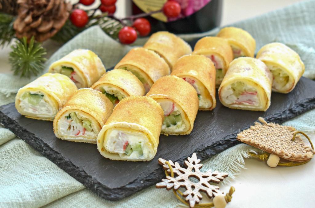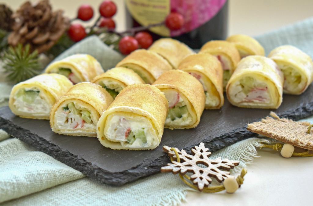 Обычные тонкие блинчики могут стать отличной основой для разнообразных закусок. Предлагаю приготовить рулетики из блинов с начинкой из крабовых палочек, творожного сыра и свежего огурца. Закуска получается нежной, аппетитной и очень вкусной, она прекрасно подойдёт как для семейного ужина, так и для праздничного стола.