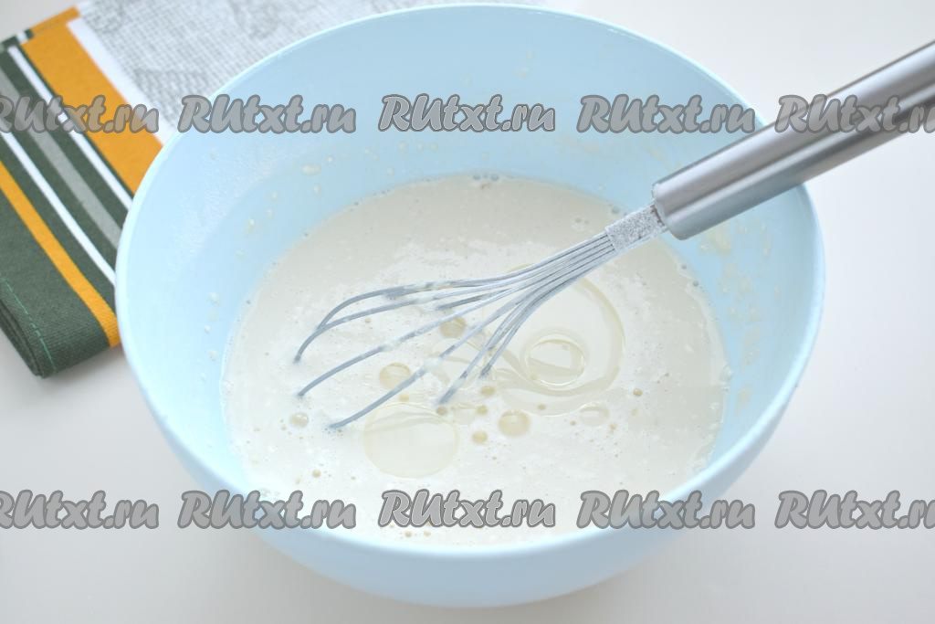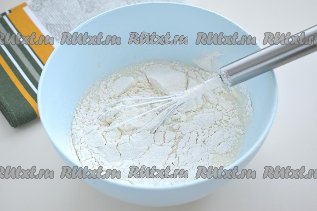 Небольшими порциями добавляем в миску муку, каждый раз тщательно вмешивая её в тесто венчиком.