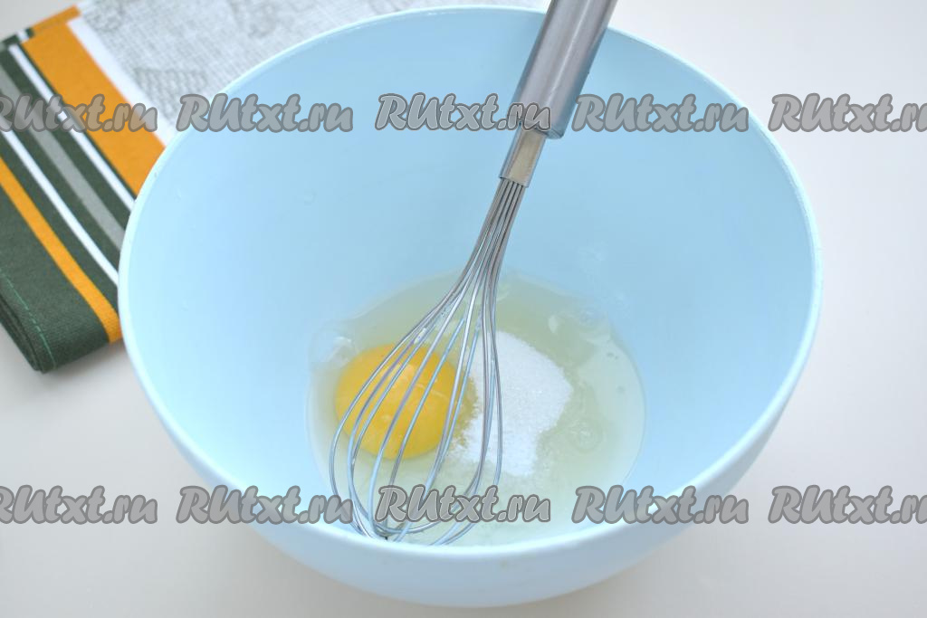 Прежде всего замесим блинное тесто, для этого разбиваем в достаточно глубокую миску сырое яйцо, всыпаем к нему сахар и соль, перемешиваем яичную смесь венчиком до однородности.