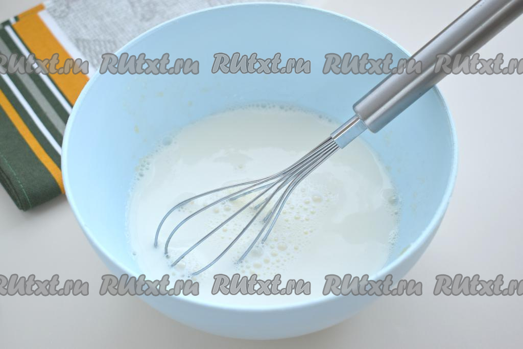 Молоко на плите (или в микроволновке) подогреваем до комнатной температуры. В миску с яичной смесью вливаем молоко комнатной температуры, перемешиваем до однородности.