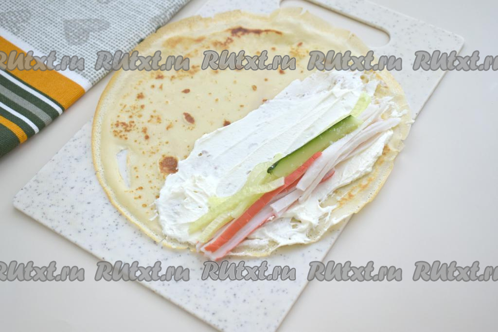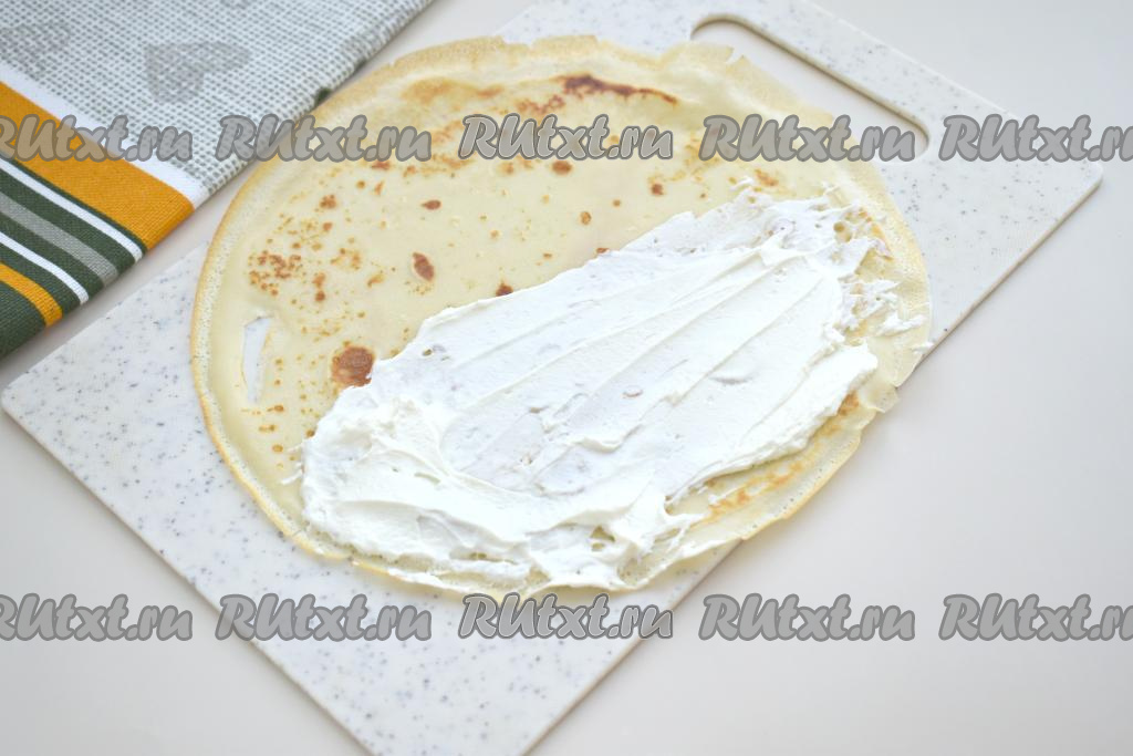 Даём блинчикам немного остыть. Заранее размораживаем крабовые палочки. Огурец моем, обрезаем кончики с двух сторон. В небольшой ёмкости смешиваем творожный сыр и майонез. Раскладываем на доске первый блин. Одну половину блина, немного отступая от краёв, смазываем 1,5 столовыми ложками творожного сыра, смешанного с майонезом.
