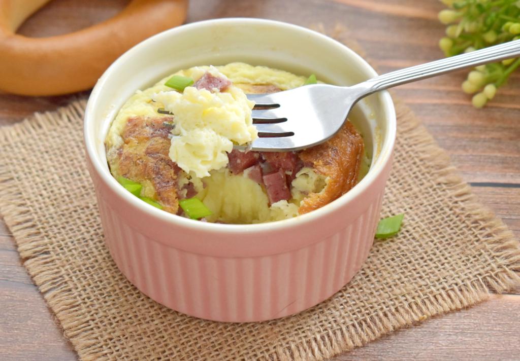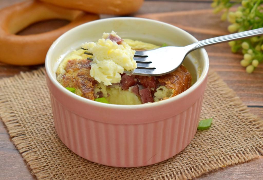 Достаём формочку с омлетом с колбасой из чаши аэрогриля и сразу подаём к столу. Омлет получился нежным, в меру плотным, его можно подать к столу и на завтрак, и в качестве быстрого перекуса в течение дня.