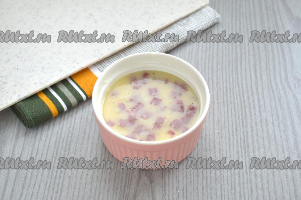 Небольшую формочку для запекания смазываем изнутри сливочным маслом, выливаем в неё омлетную массу с колбасой.