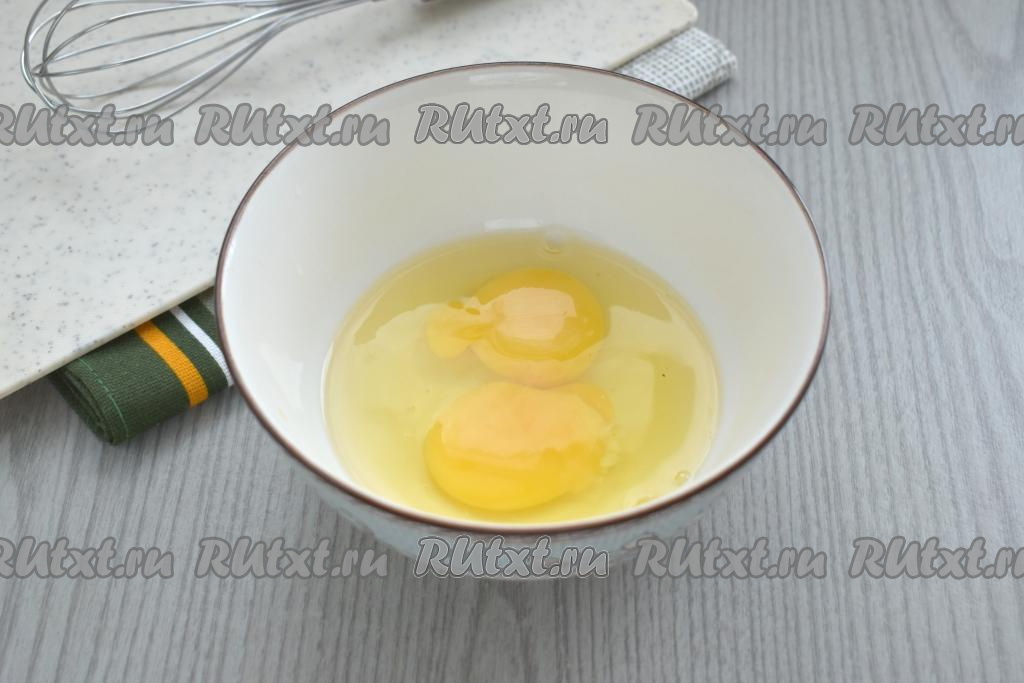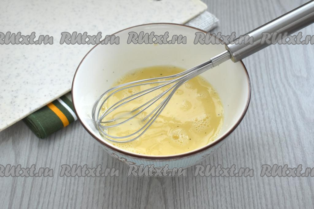 Взбиваем яйца с молоком венчиком до получения однородной смеси. Долго взбивать не нужно, как только омлетная масса станет однородной, значит больше взбивать не нужно.