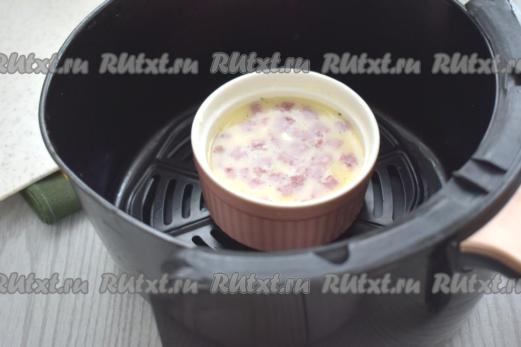 Формочку устанавливаем в чашу аэрогриля. Отправляем чашу в аэрогриль. Включаем аэрогриль на 175 градусов, время устанавливаем на 10-15 минут. Через 10 минут проверяем готовность омлета с колбасой, его поверхность должна быть в меру плотной, не жидкой.