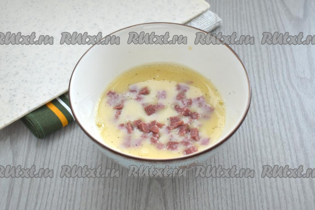В получившуюся омлетную массу добавляем колбасу, нарезанную на мелкие кубики, перемешиваем столовой ложкой.