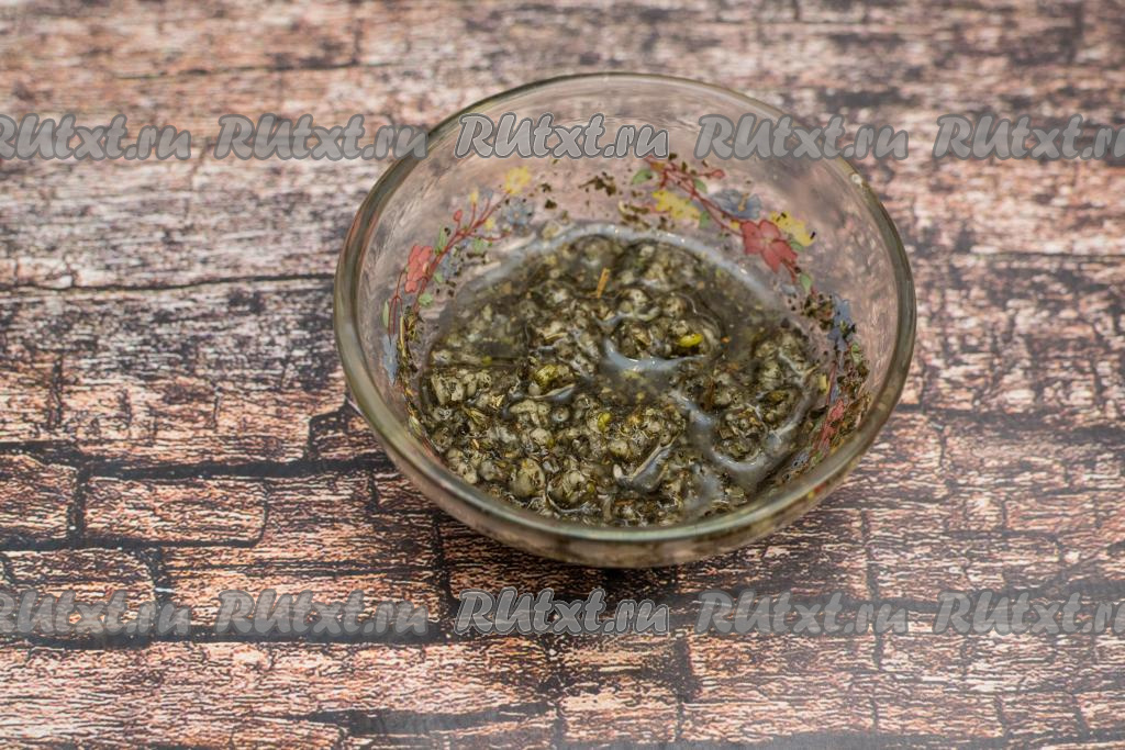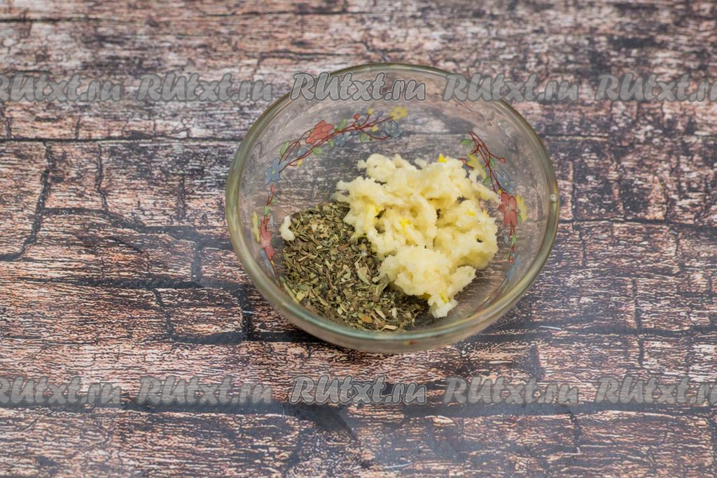 В небольшую пиалу выложить очищенный чеснок, натёртый на мелкой тёрке, добавить сушёный базилик.