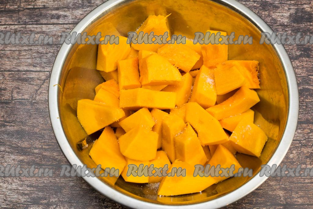 Сложить нарезанную тыкву в глубокую миску, посолить и поперчить по вкусу, хорошо перемешать.