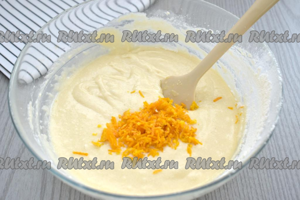 Понемногу добавляя оставшуюся муку и каждый раз полностью вмешивая её венчиком, замешиваем однородное тесто, напоминающее сметану средней жирности. Как только добились теста нужной густоты, значит больше муку добавлять не нужно. В зависимости от жирности кефира, величины яиц, вам может потребоваться немного больше или меньше муки, чем указано в ингредиентах, поэтому советую ориентироваться именно на густоту теста для пирога. Добавляем в тесто апельсиновую цедру, хорошо перемешиваем.