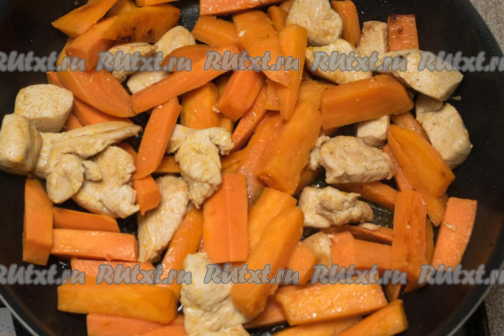 Перемешать и жарить курицу с бататом, периодически перемешивая, в течение 10 минут.