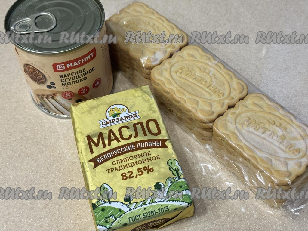 Подготовить продукты. Сливочное масло предварительно достать из холодильника, чтобы оно успело согреться при комнатной температуре и стать достаточно мягким. Песочное печенье подойдёт любое, я взяла классическое "Юбилейное" печенье.