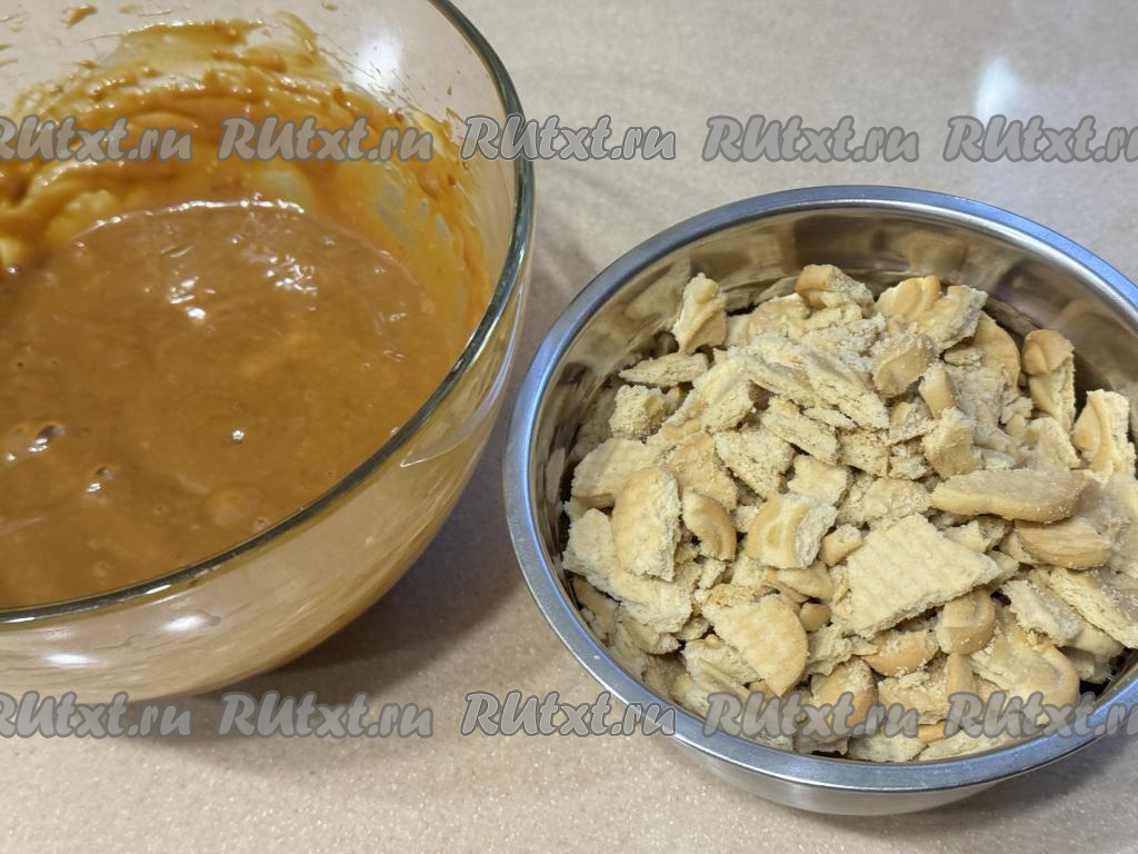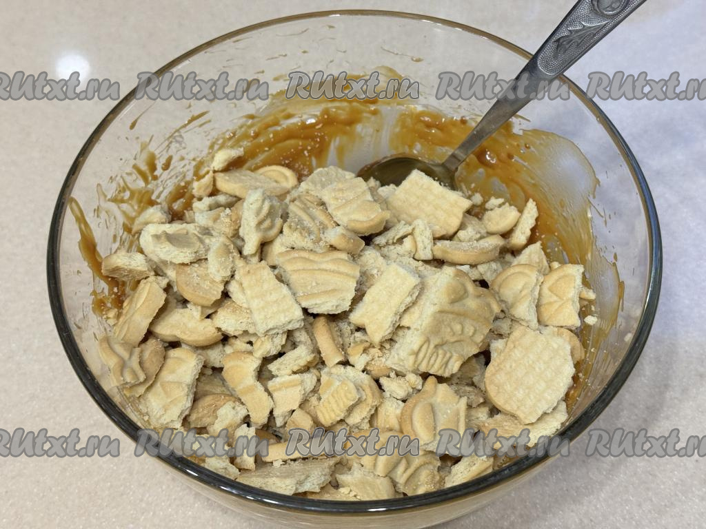 Добавить кусочки печенья в миску с кремом из сгущёнки и масла.