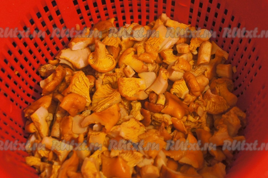 Лисички тщательно промыть, почистить и нарезать на небольшие кусочки.