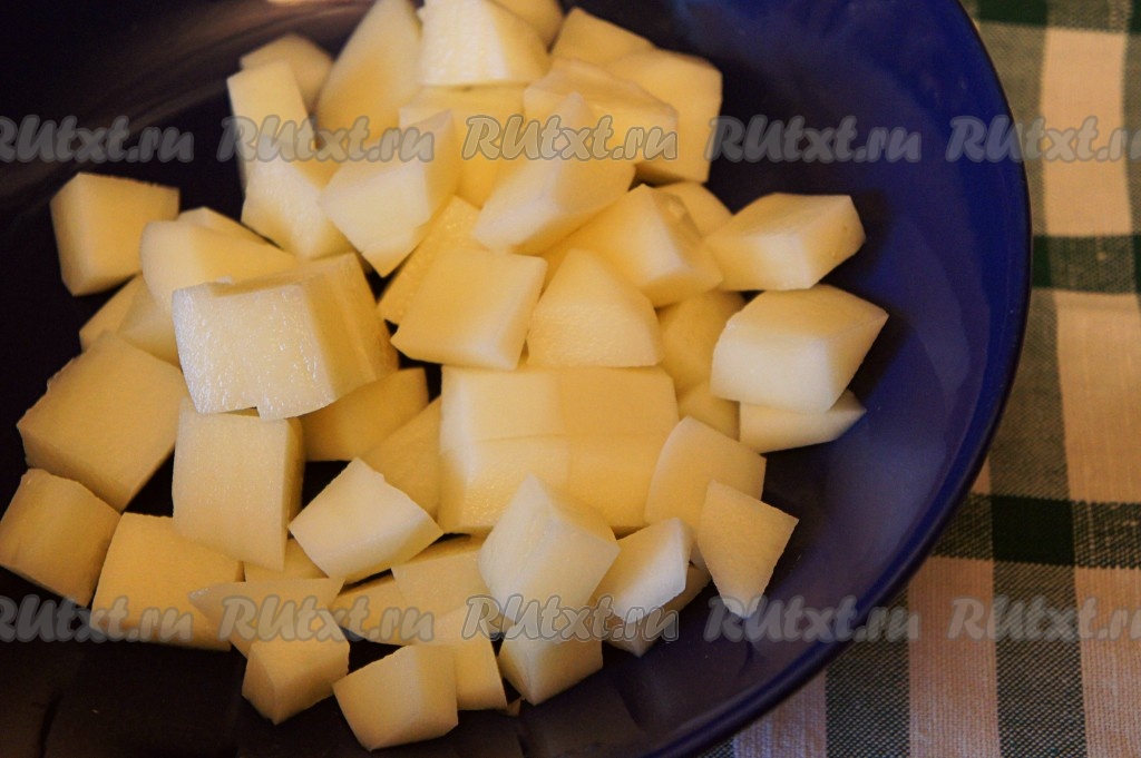 Добавить 0,5 литра воды и варить после закипания воды на среднем огне ещё 5 минут. Затем добавить нарезанный картофель, перемешать. Готовить ещё 5 минут.