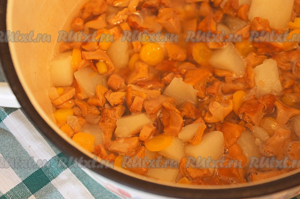 Периодически убирайте с супа накипь. Готовить суп из лисичек на среднем огне ещё 5-7 минут.