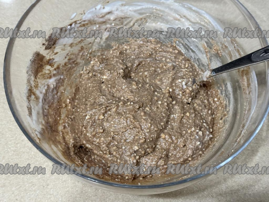 В миску с творожной массой всыпать муку, какао и разрыхлитель.