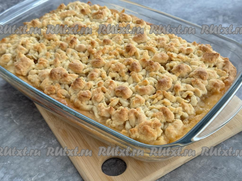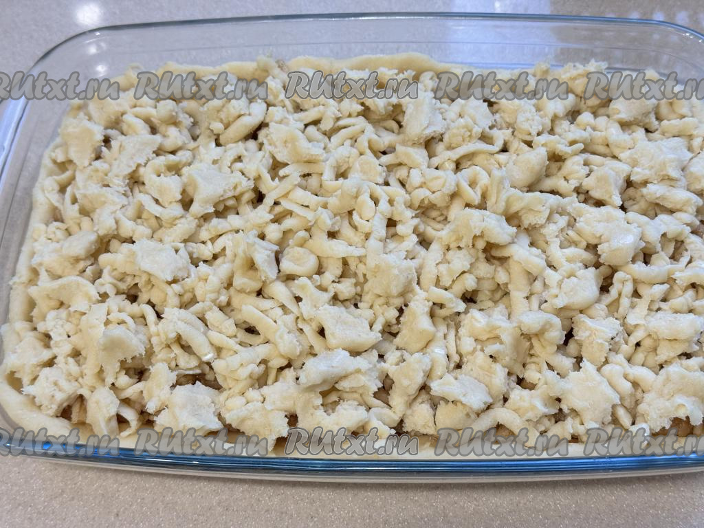 Вторую часть теста достать из морозилки, натереть на крупной тёрке и равномерно выложить поверх начинки.