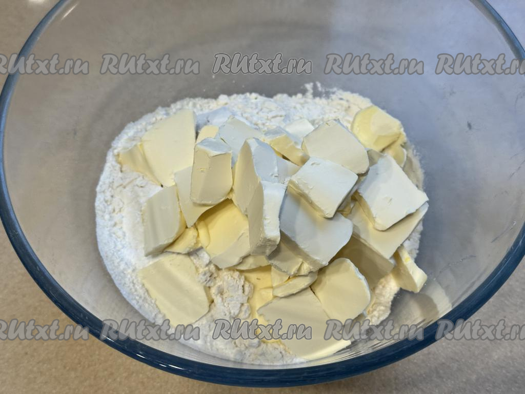 В отдельную достаточно объёмную миску всыпать 350 грамм муки и весь разрыхлитель. Маргарин (или сливочное масло) достать из холодильника, нарезать на кусочки, добавить в миску с мукой и разрыхлителем, перетереть массу руками до получения мелкой, однородной песочной крошки.