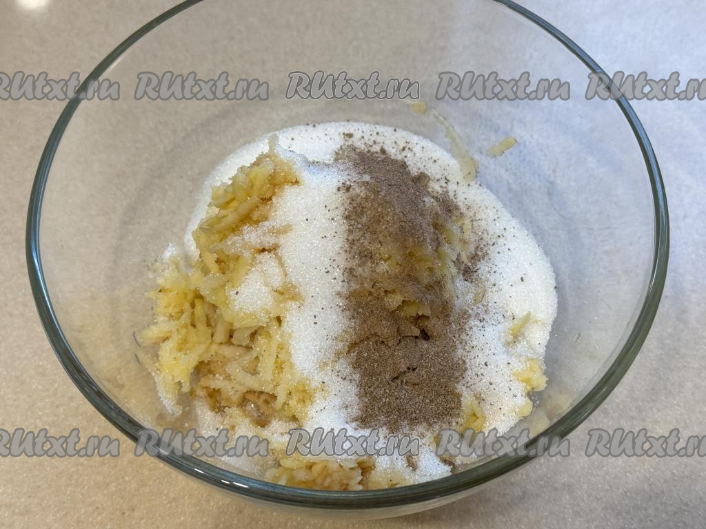 В миску с натёртыми яблоками всыпать сахар и корицу, перемешать и начинка для песочной шарлотки готова.
