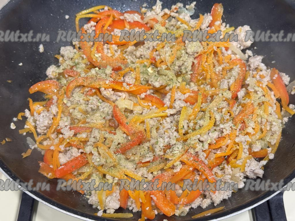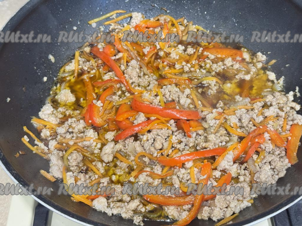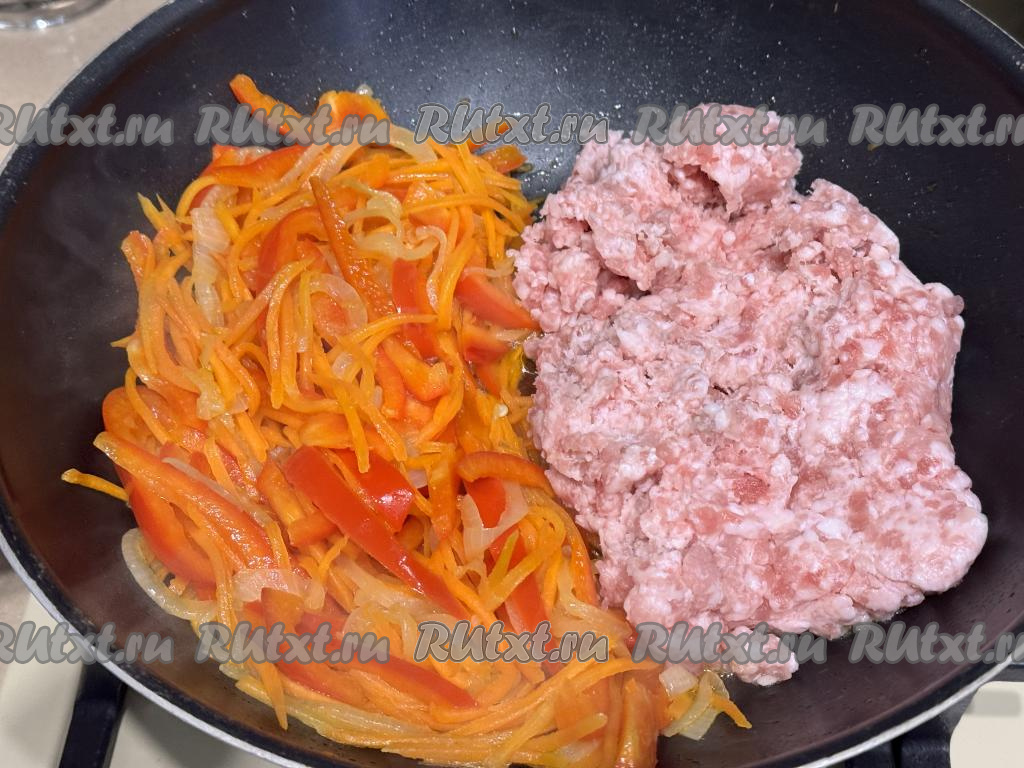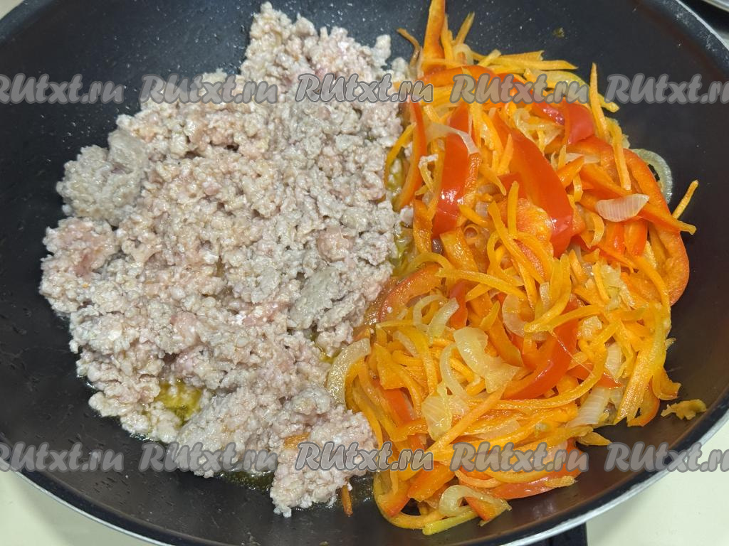 Обжарить фарш минут 7-8, часто разбивая комочки мяса. Овощи на второй половине сковороды тоже не забывать время от времени перемешивать. Если вам неудобно обжаривать фарш и овощи на разных половинах одной сковороды, тогда обжаривайте их на разных сковородках, а в дальнейшем просто объедините их на одной сковороде.