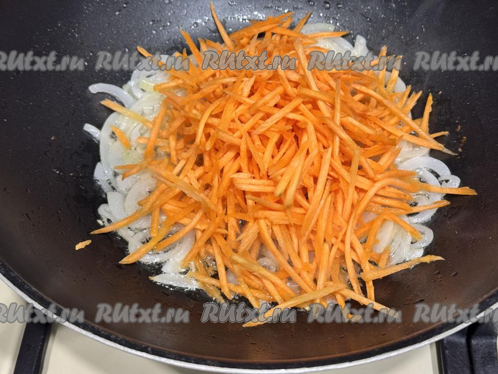 Обжарить лук, иногда помешивая, до прозрачности (в течение минут 5), затем добавить морковку, натёртую на тёрке для корейской моркови (если такой тёрки нет, можно просто натереть морковку на крупной тёрке), перемешать овощи.