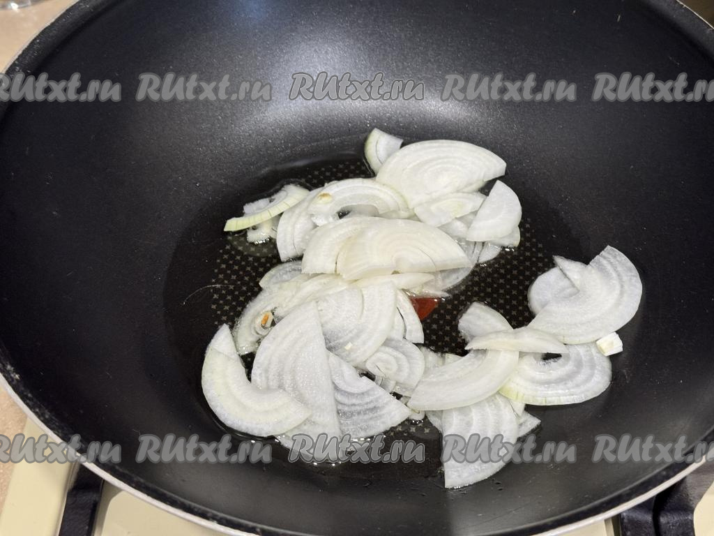 В достаточно глубокую сковороду влить растительное масло, дать ему хорошо прогреться, уменьшить огонь до среднего. После этого выложить в сковороду луковицу, нарезанную на средние полукольца.