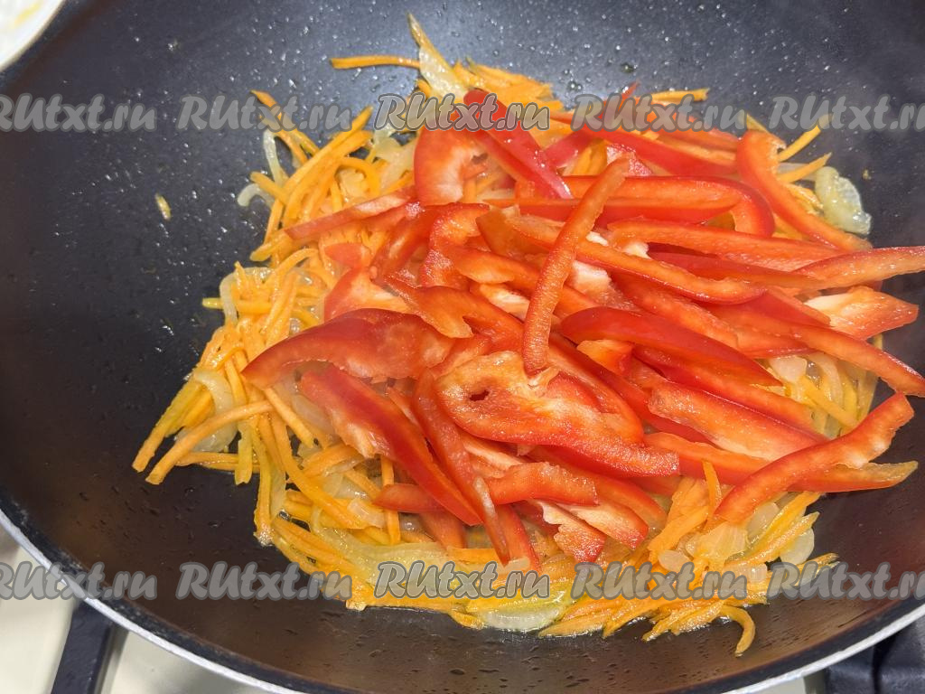 Обжарить лук с морковью в течение 5-6 минут, иногда перемешивая. К обжаренным овощам добавить болгарский перец, нарезанный на тонкие полоски, перемешать.