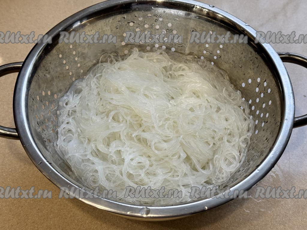 По прошествии 5 минут откинуть фунчозу на дуршлаг, промыть холодной водой.