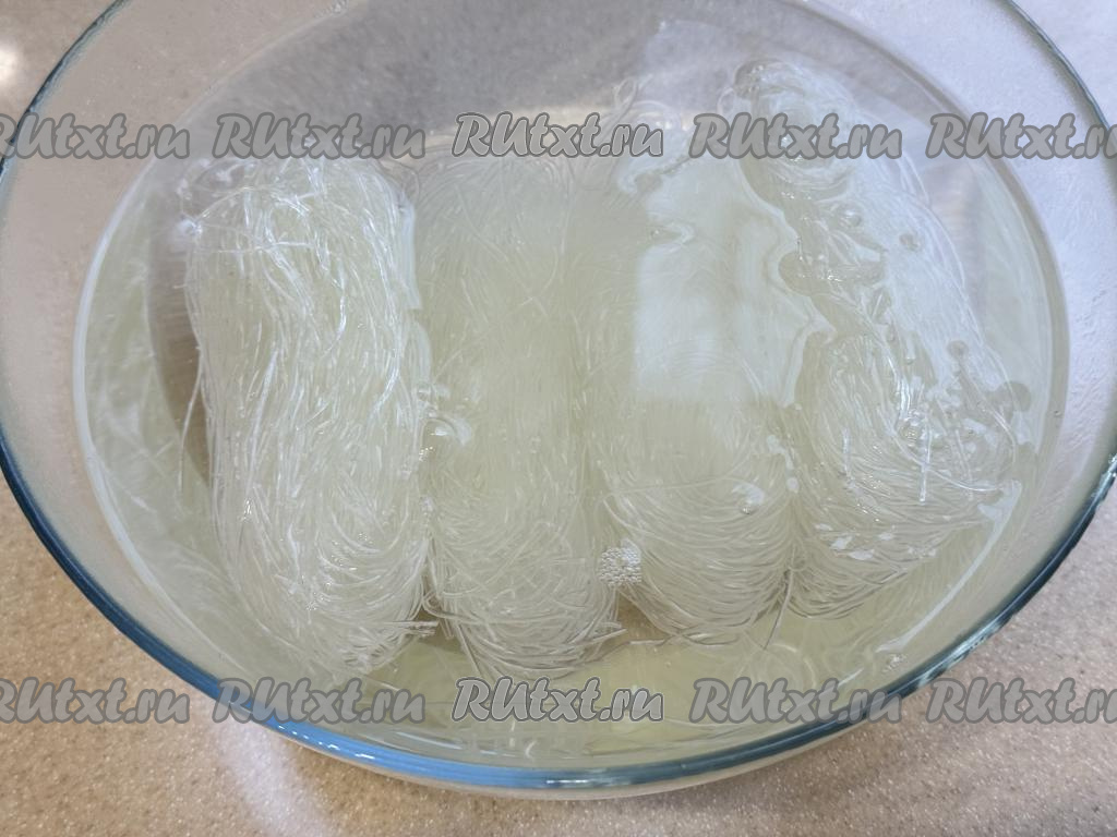 Пока обжариваются фарш с овощами, нужно в достаточно глубокую миску выложить фунчозу, залить её полностью кипящей водой и оставить на 5 минут.