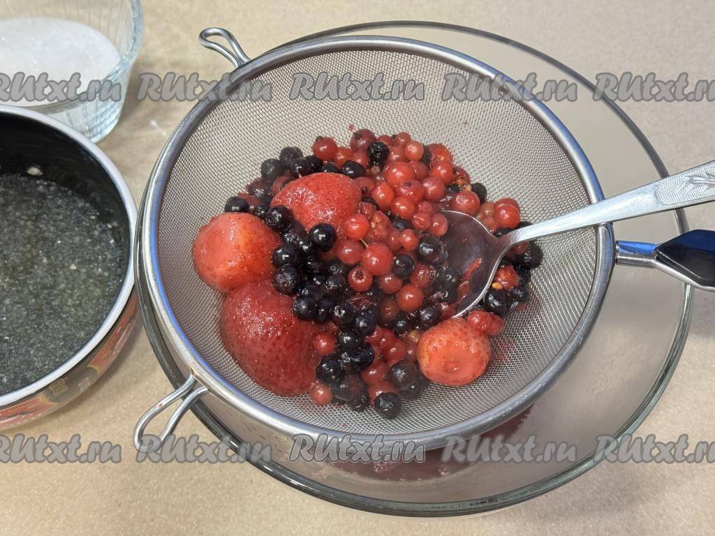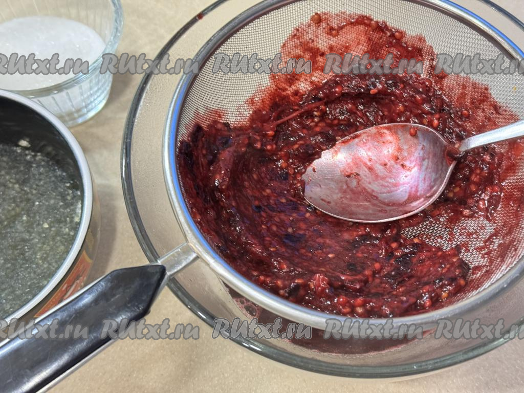 Взять достаточно глубокую миску, поверх неё поставить сито. Вылить в сито ягоды вместе с жидкостью, в которой они варились. В миске будет процеженная жидкость, а в сите останутся ягоды. С помощью столовой ложки перетереть ягоды через сито в миску.