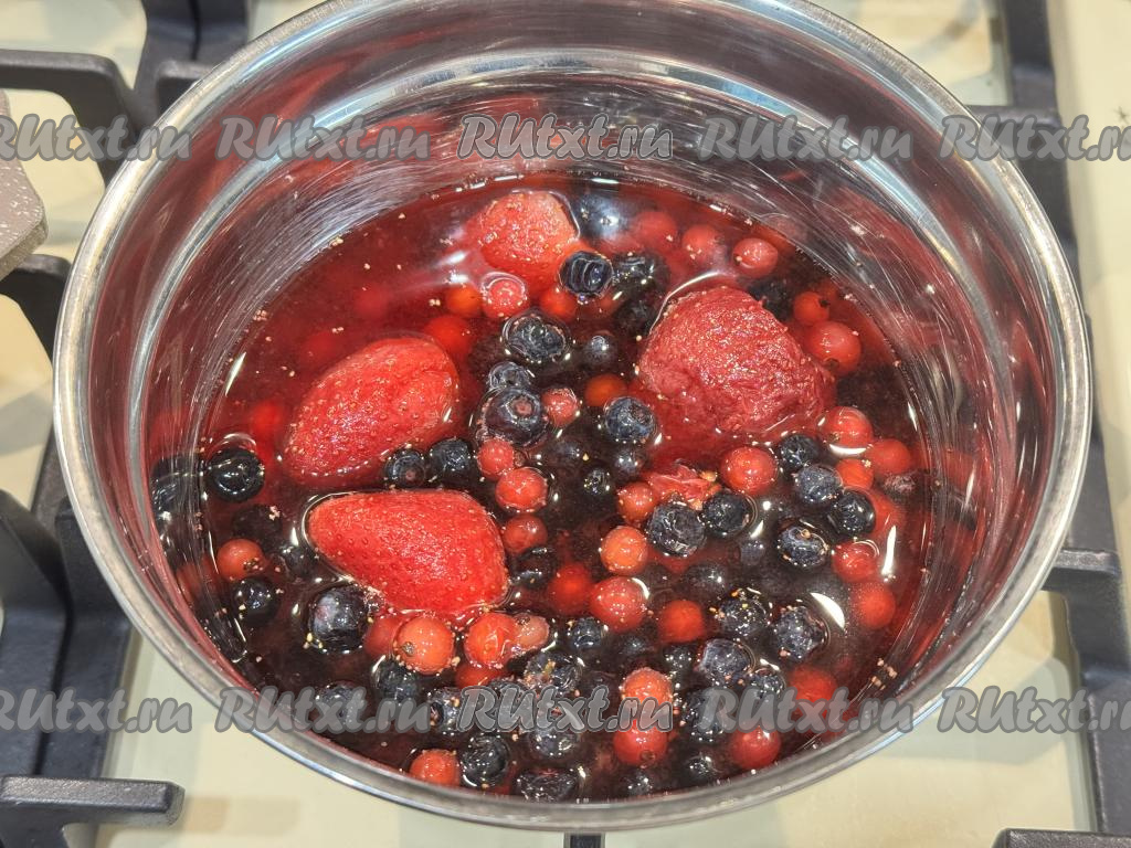 Набухшую желатиновую массу нужно прогреть до полного растворения кристалликов желатина. Это можно сделать, постоянно помешивая, на плите на среднем огне, не давая желатину закипеть. Я же предпочитаю прогревать набухший желатин в микроволновке в течение секунд 30-40. Для этого посуду, подходящую для приготовления в микроволновке, с набухшим желатином я ставлю на 10 секунд в микроволновку, затем достаю из микроволновки, хорошо перемешиваю, снова отправляю на 10 секунд в микроволновку и ещё раз достаю, перемешиваю. Если кристаллики ещё не все растворились, тогда повторяю эту процедуру ещё 1-2 раза, прогревая желатин по 10 секунд и каждый раз хорошо перемешивая. Очень важно, прогревая желатиновую массу, не дать ей закипеть. В миску с ягодной массой добавить прогревшуюся желатиновую массу.