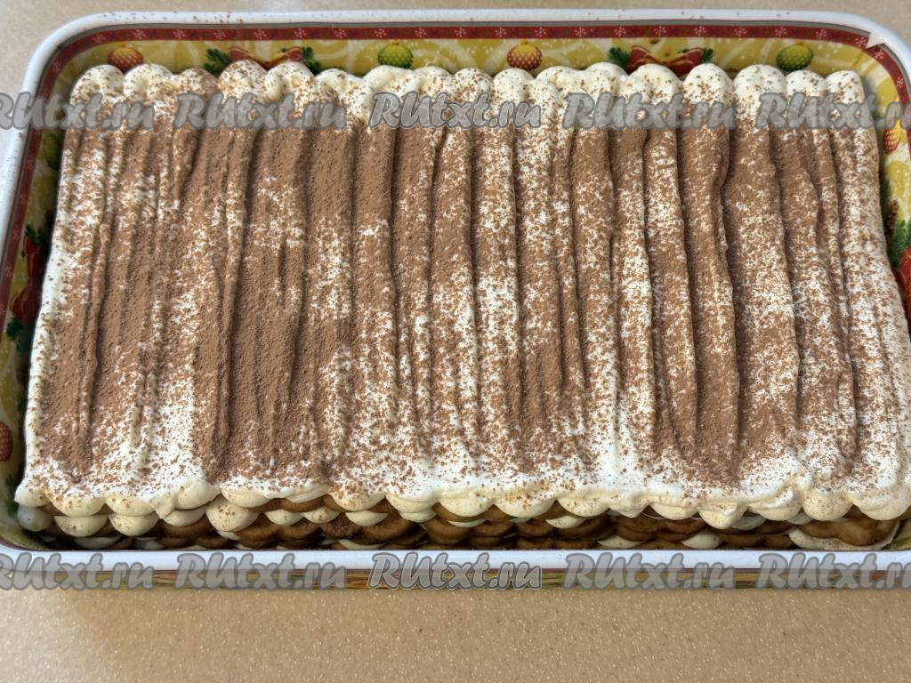 Поставить тирамису пропитываться в холодильник на 4 часа (можно и на ночь). Готовый тирамису присыпать сверху какао.