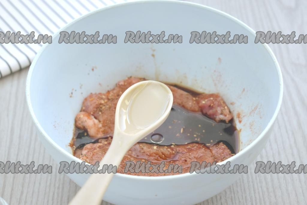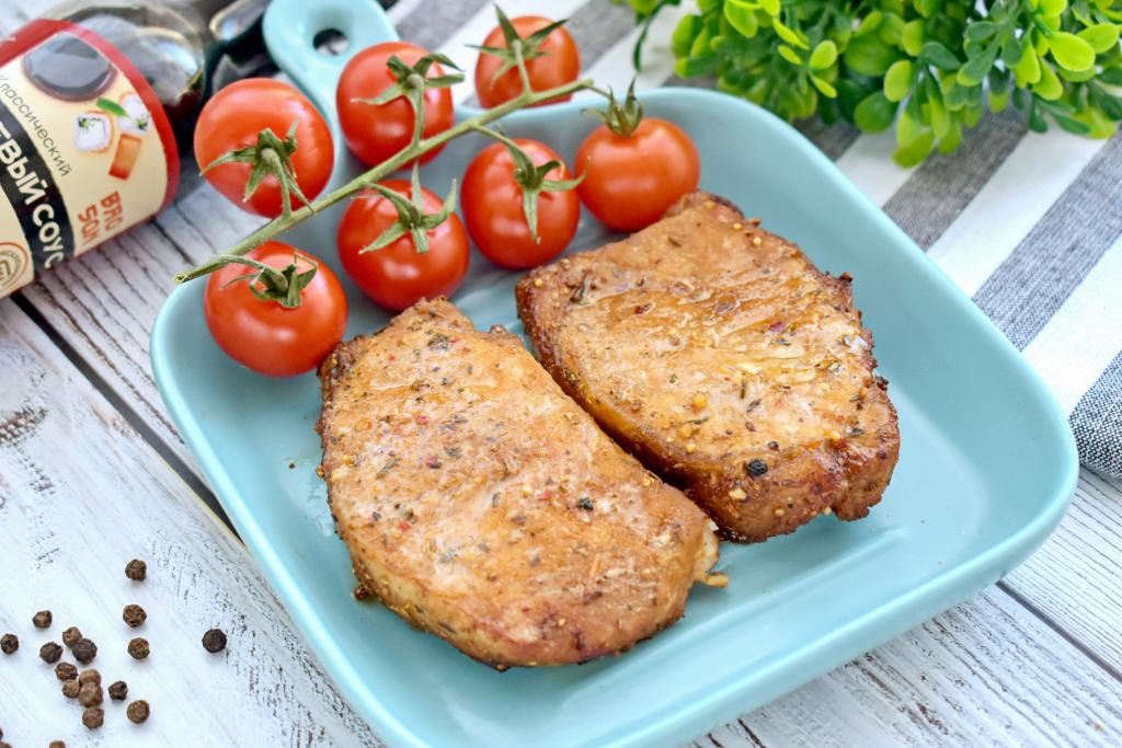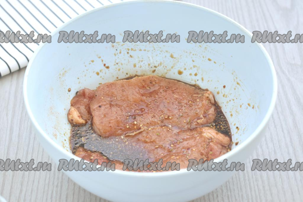 Стейки из карбоната свинины перекладываем в миску. Натираем мясо со всех сторон специями (в качестве специй я добавила 1 чайную ложку приправы для свинины и паприку). Немного солим свинину со всех сторон (добавляя соль, обязательно учитывайте, что соевый соус достаточно солёный).