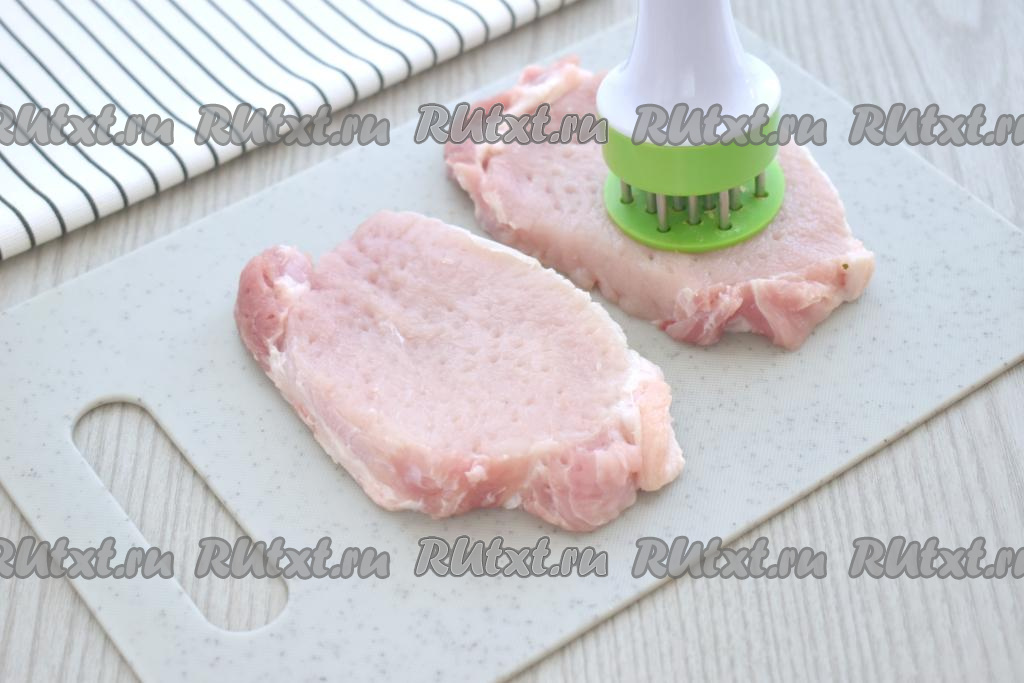 Свиной карбонат разрезаем вдоль на 2 равные части, у меня получились 2 стейка толщиной чуть больше 2 сантиметров. Для того чтобы мясо в дальнейшем лучше пропиталось специями и соевым соусом, каждый стейк накалываем с помощью тендерайзера-рыхлителя - специального приспособления для мяса (или слегка отбиваем кулинарным молоточком).