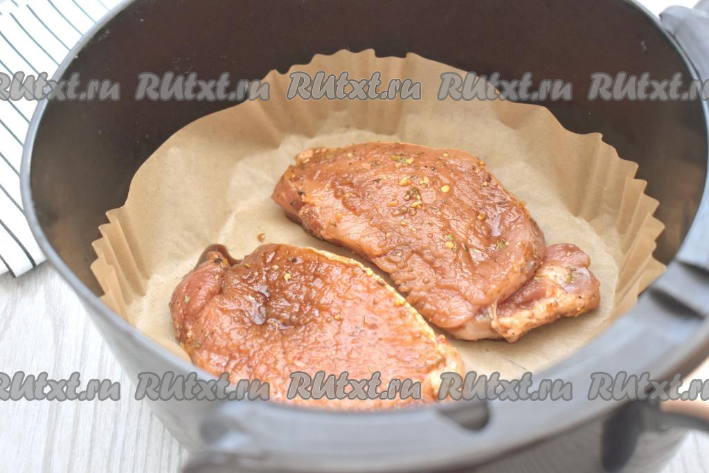 Чашу аэрогриля застилаем пергаментом, затем выкладываем стейки из карбоната свинины, замаринованные в соевом соусе. Чашу с мясом отправляем в аэрогриль. Включаем аэрогриль на 180 градусов, время устанавливаем - 30 минут.