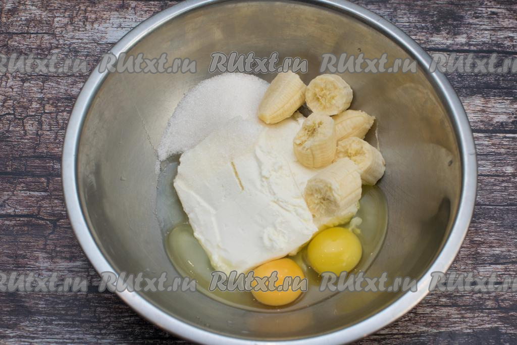 Погружным блендером пробить творог, яйца, банан и сахар до получения однородной творожно-банановой массы.