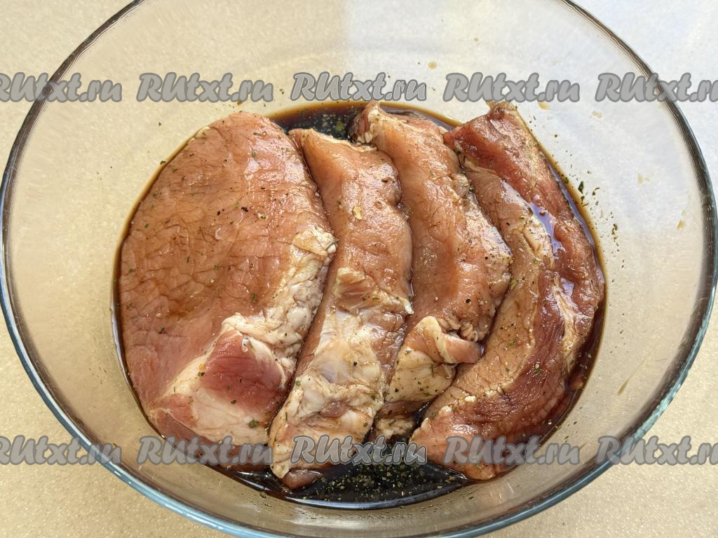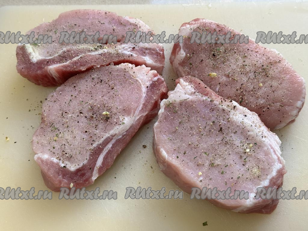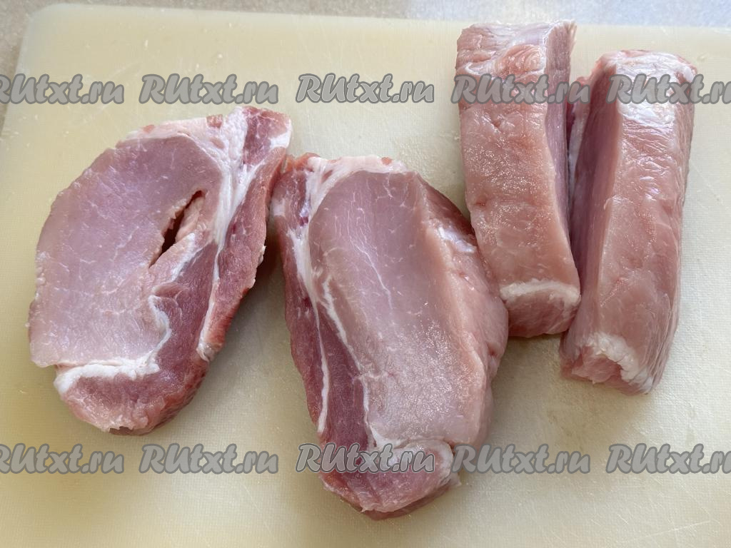 Нарезать свинину на стейки толщиной примерно 2,5-3 сантиметра.