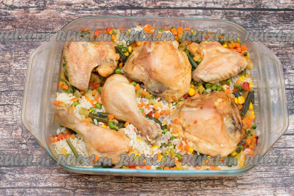Рис с курицей и мексиканской смесью запекать в духовке в течение 80 минут. Готовность блюда проверяйте по рису, расположенному по центру формы (рис, который находится по краям формы и соприкасается с ней, будет готов немного раньше, чем рис, в центре). Рисинки должны стать мягкими, хорошо пропаренными.