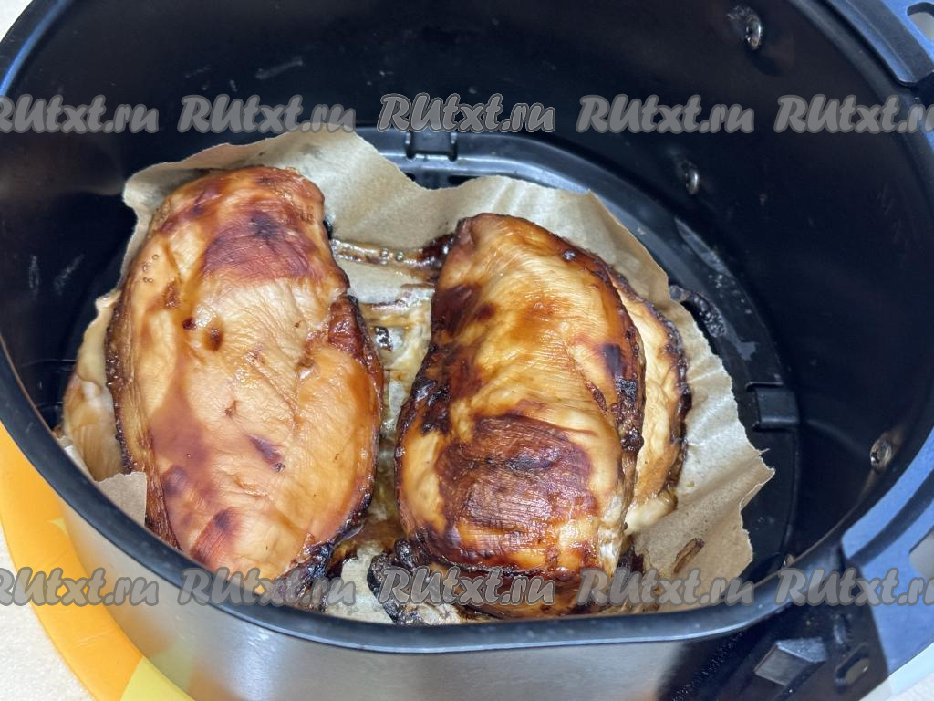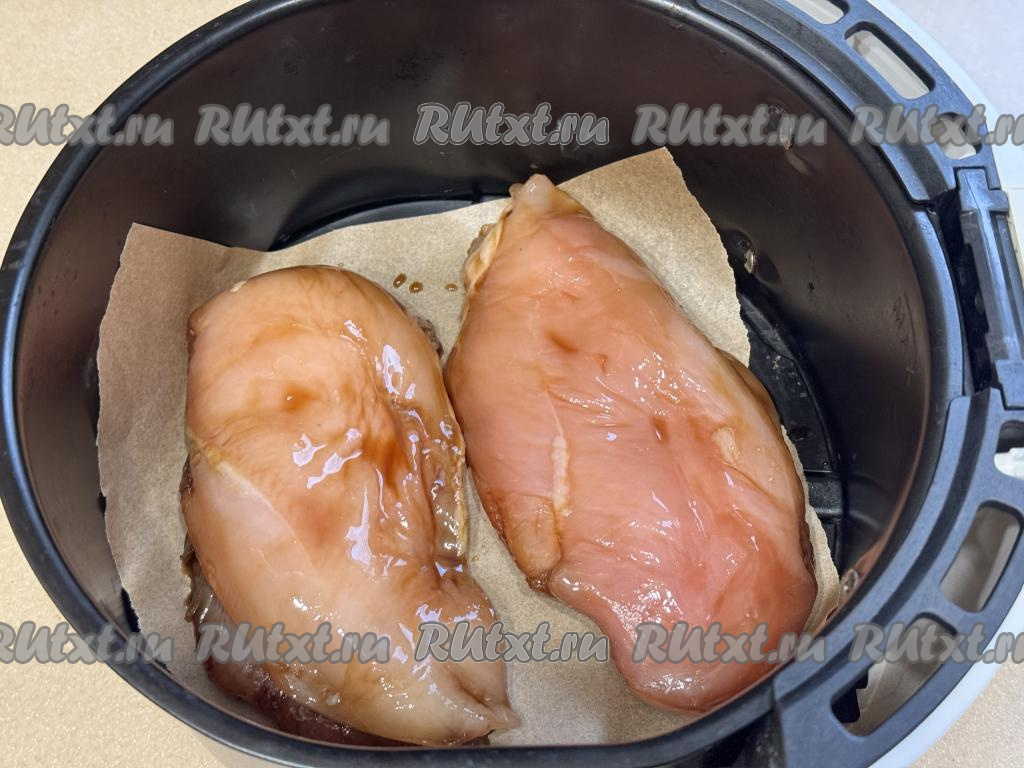 Дно чаши аэрогриля застелить куском пергаментной бумаги, выложить куриную грудку, замаринованную в соевом соусе. Отправить чашу в аэрогриль.
