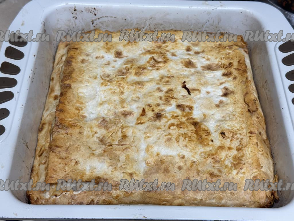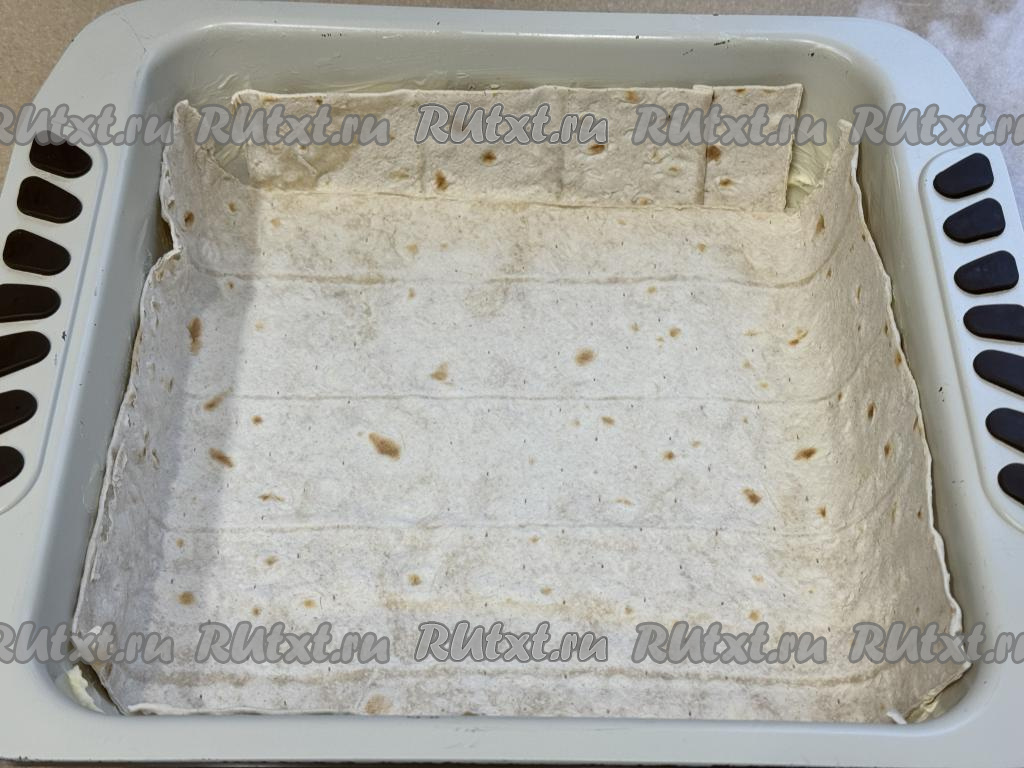 Подогнуть края лаваша с бортиков, накрыть начинку отложенным ранее листом лаваша, закрывая всю начинку.